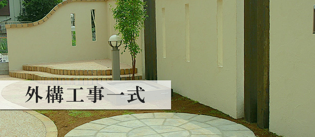 外構工事とは、建物本体以外の外部廻りの工事のことをさします。具体的には、コンクリート舗装工事、排水工事、造園植栽工事などの工事です。